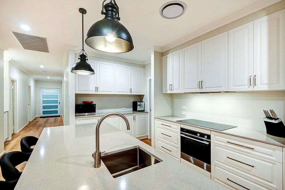 This home has an open-plan living area, a theatre room, a double garage, and a separate caravan storage, making it ideal for contemporary families. The kitchen is symmetrically designed, with the butler's pantry adjoining on one side and the laundry on the other, creating a highly functional space for daily life.